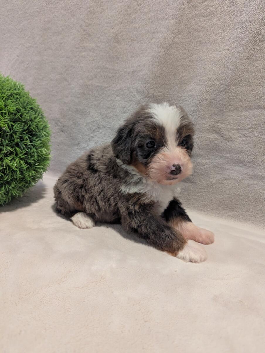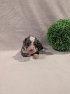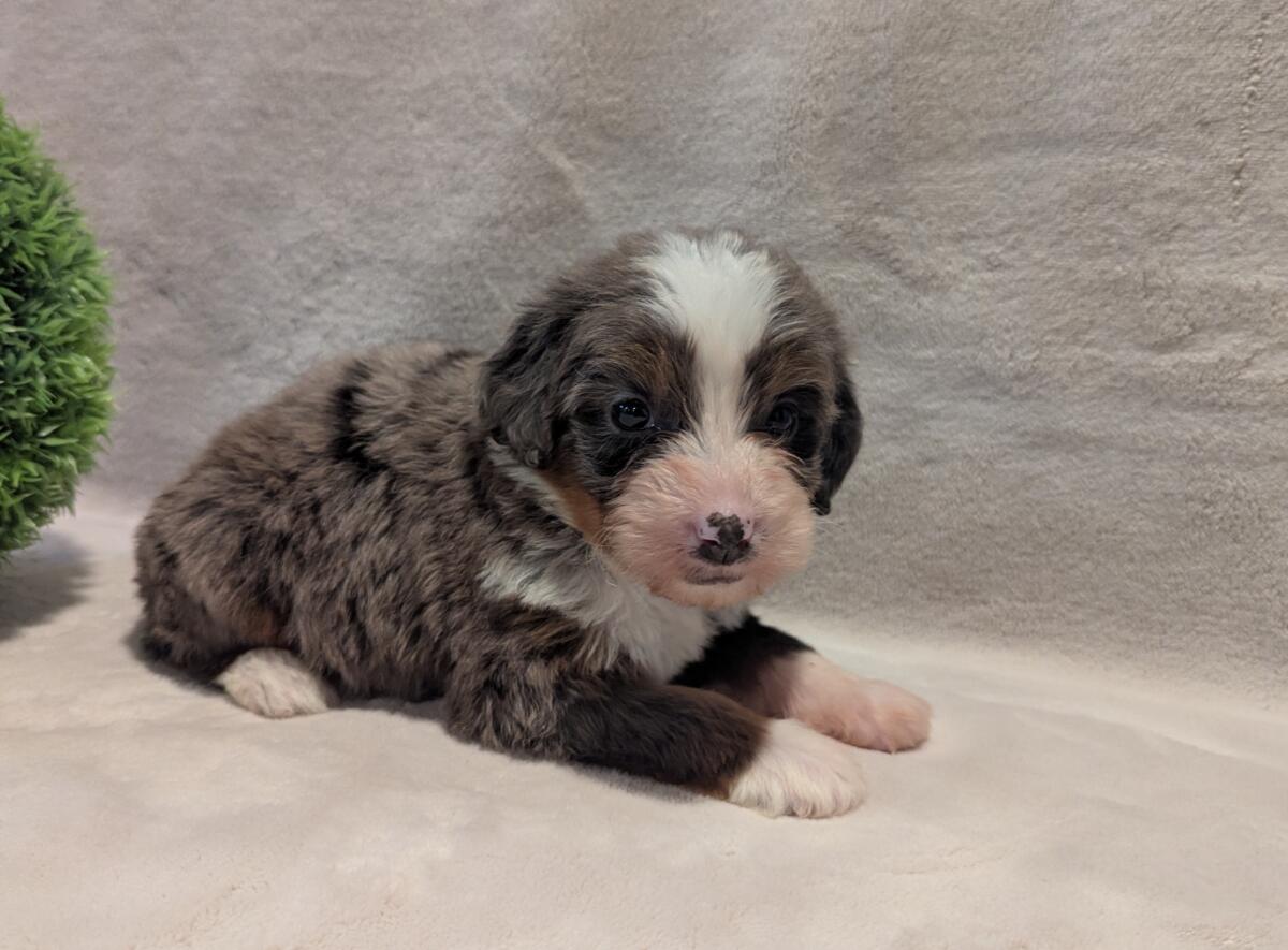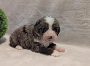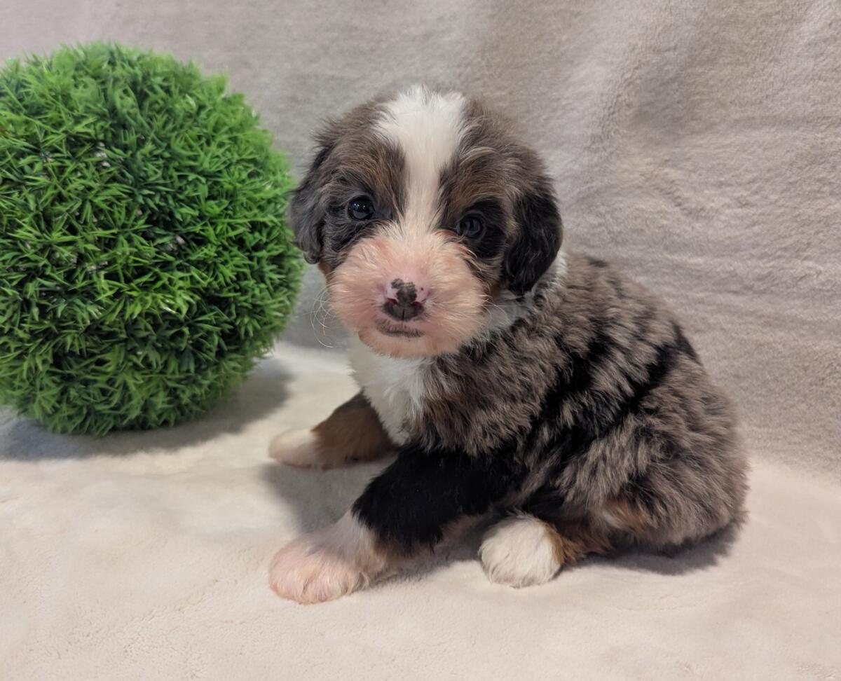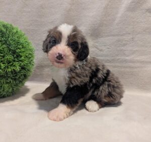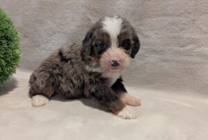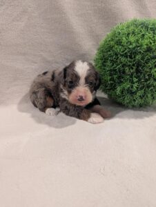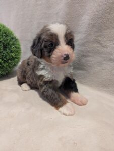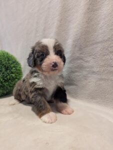 This beautiful Merle Bernedoodle is the smallest in the litter and will be the perfect companion for snuggles, adventures, and everything in between. His soft, wavy coat is hypoallergenic and mostly non-shedding, making him the perfect companion for families with allergies. He will come home current on all age-appropriate vaccinations and wormers. He will have had a visit with our vet to make sure he is healthy and ready to go to his new home. He will also come home with his own collar, leash, and chew toy. He will also have a personal blanket that smells like his mom to help with adjusting to his new home. He has been handled by people daily and has been exposed to many new experiences, sounds, and objects to help him to be more comfortable to his new home. He will have a AKC reunite microchip.