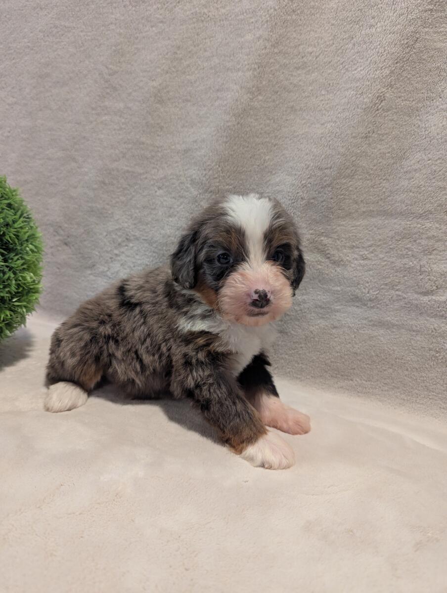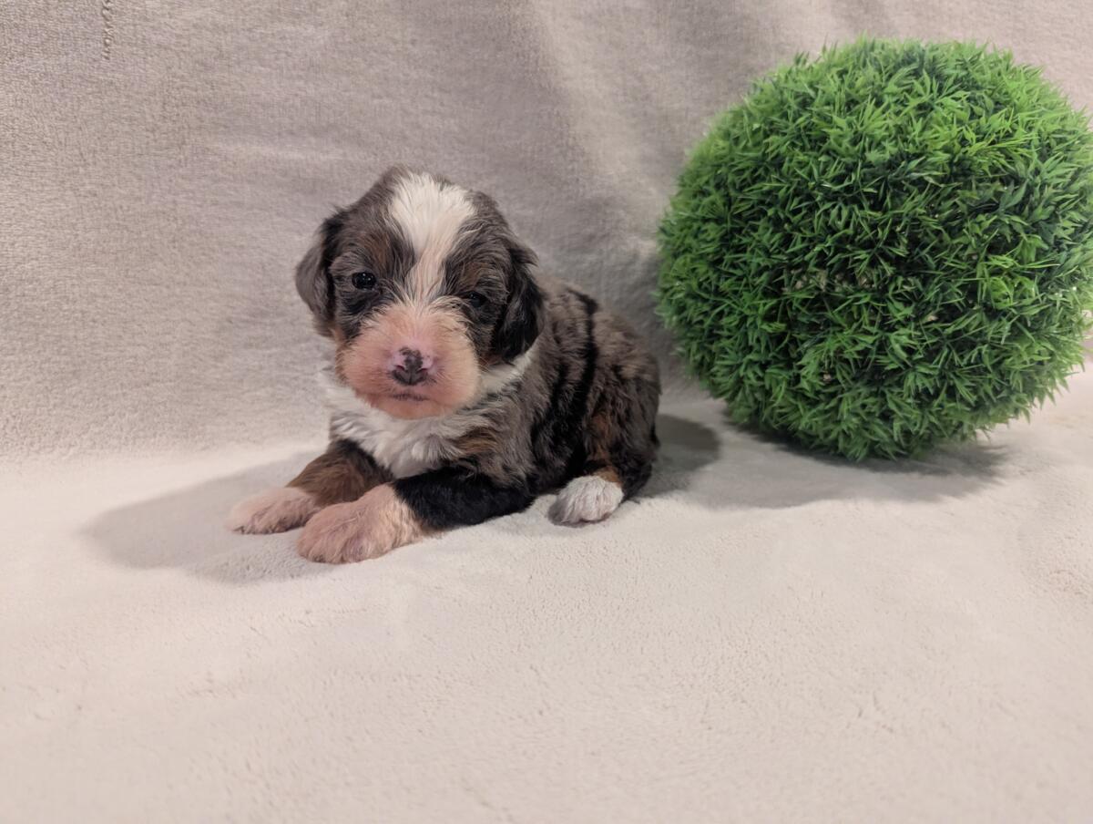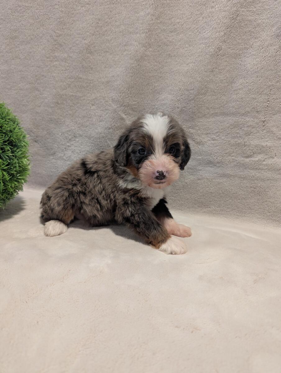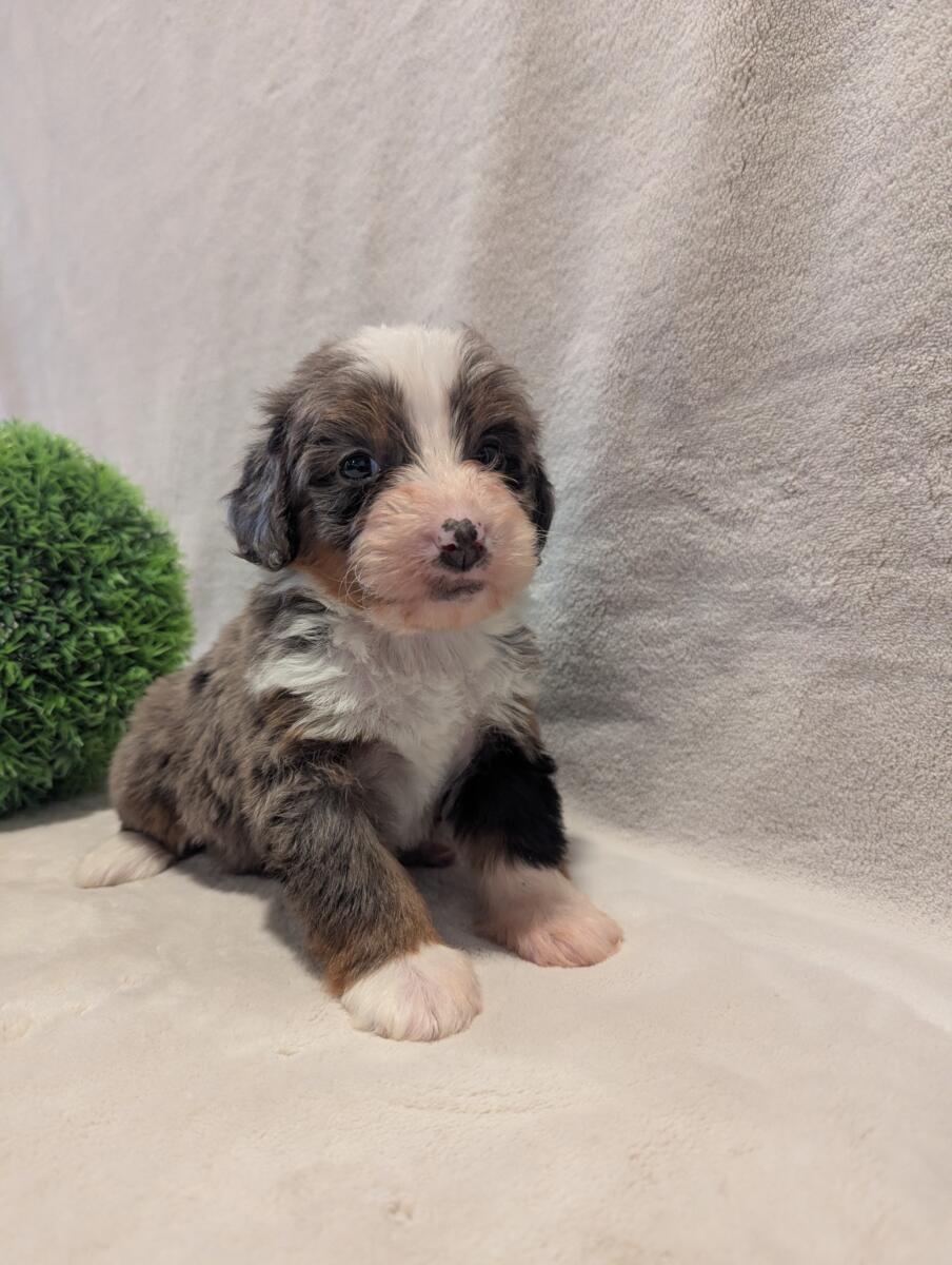 This beautiful Merle Bernedoodle is the smallest in the litter and will be the perfect companion for snuggles, adventures, and everything in between. His soft, wavy coat is hypoallergenic and mostly non-shedding, making him the perfect companion for families with allergies. He will come home current on all age-appropriate vaccinations and wormers. He will have had a visit with our vet to make sure he is healthy and ready to go to his new home. He will also come home with his own collar, leash, and chew toy. He will also have a personal blanket that smells like his mom to help with adjusting to his new home. He has been handled by people daily and has been exposed to many new experiences, sounds, and objects to help him to be more comfortable to his new home. He will have a AKC reunite microchip.