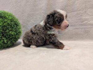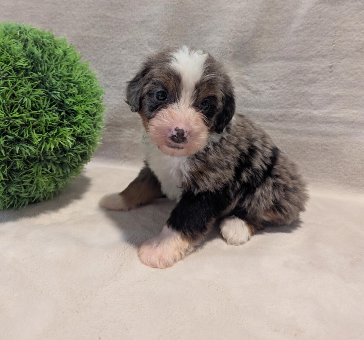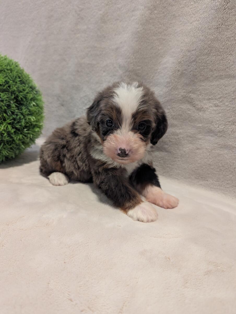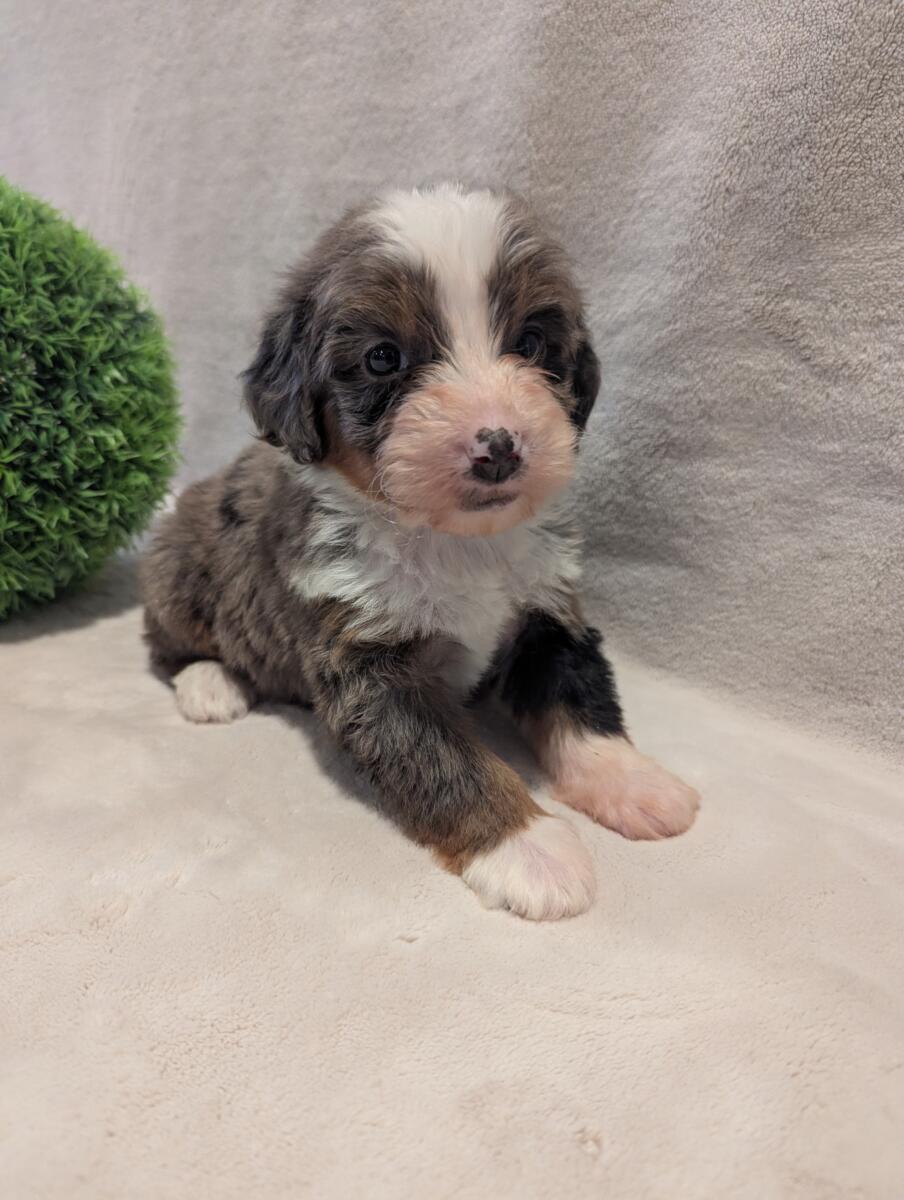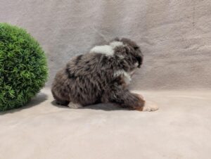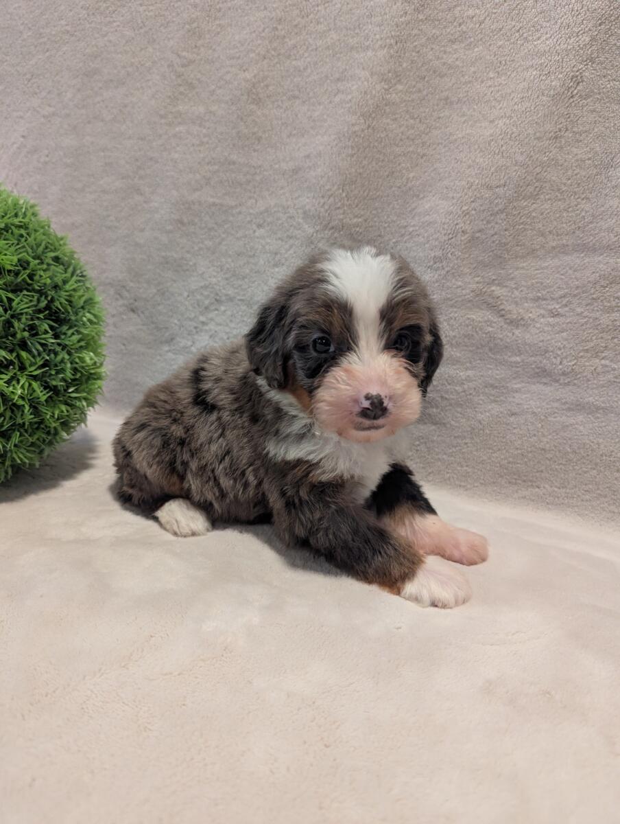 This beautiful Merle Bernedoodle is the smallest in the litter and will be the perfect companion for snuggles, adventures, and everything in between. His soft, wavy coat is hypoallergenic and mostly non-shedding, making him the perfect companion for families with allergies. He will come home current on all age-appropriate vaccinations and wormers. He will have had a visit with our vet to make sure he is healthy and ready to go to his new home. He will also come home with his own collar, leash, and chew toy. He will also have a personal blanket that smells like his mom to help with adjusting to his new home. He has been handled by people daily and has been exposed to many new experiences, sounds, and objects to help him to be more comfortable to his new home. He will have a AKC reunite microchip.