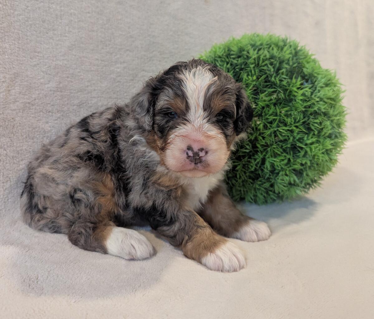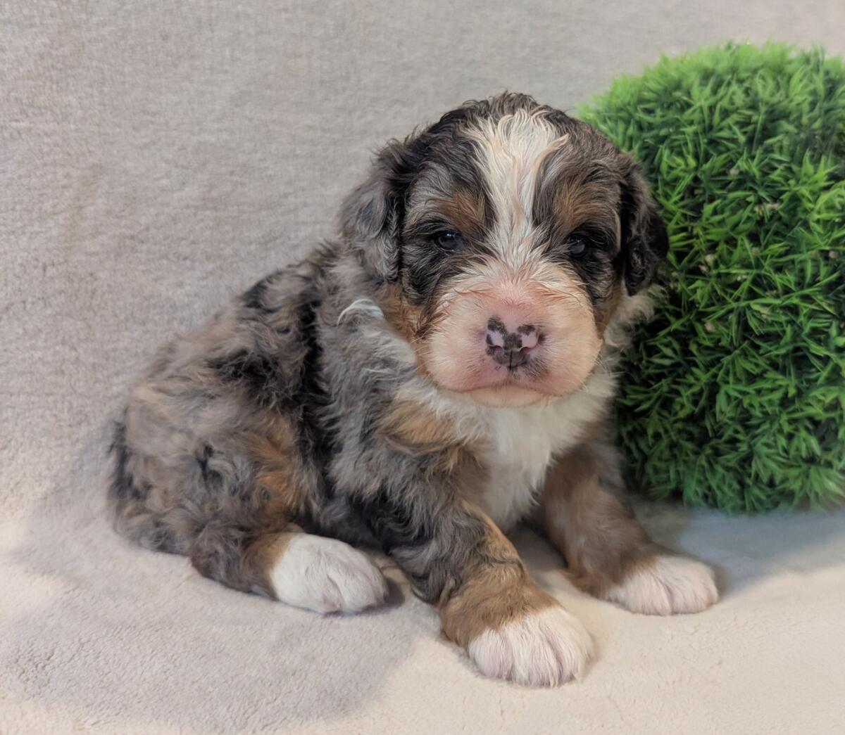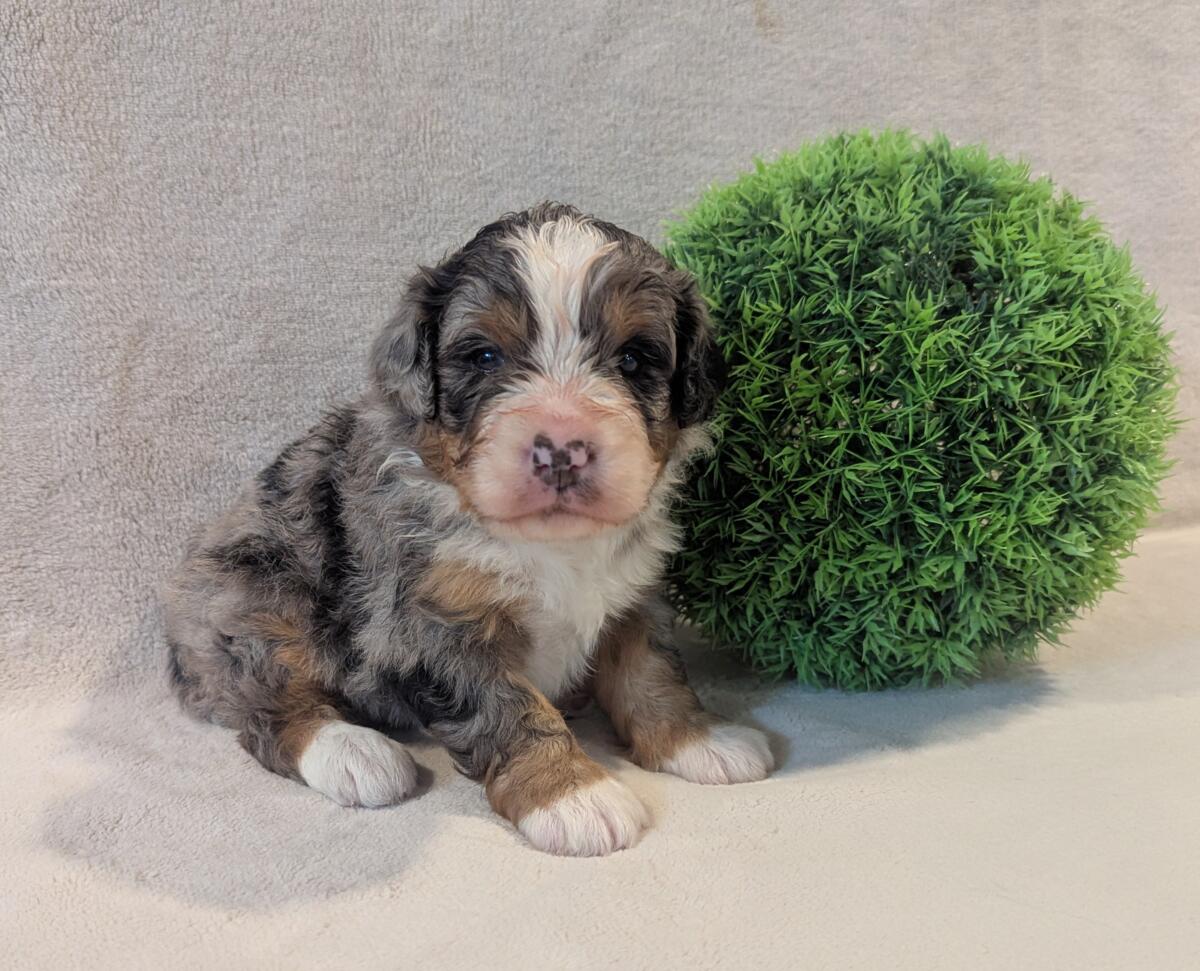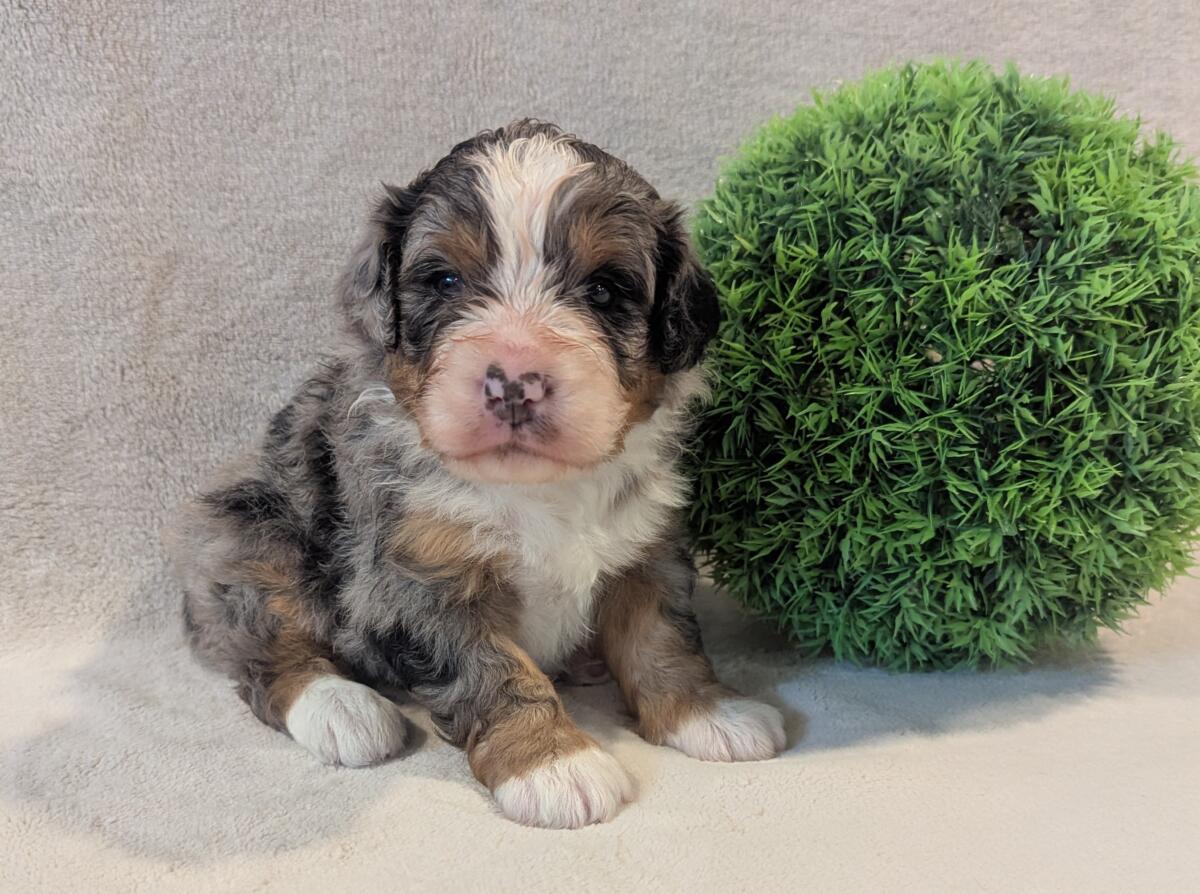 This beautiful Merle Bernedoodle is the perfect companion for snuggles, adventures, and everything in between. Her soft, wavy coat is hypoallergenic and mostly non-shedding, making her the perfect companion for families with allergies. She will come home current on all age-appropriate vaccinations and wormers. She will have had a visit with our vet to make sure she is healthy and ready to go to her new home. She will also come home with her own collar, leash, and chew toy. She will also have a personal blanket that smells like her mom to help with adjusting to her new home. She has been handled by people daily and has been exposed to many new experiences, sounds, and objects to help her to be more comfortable to her new home. She will have a AKC reunite microchip.