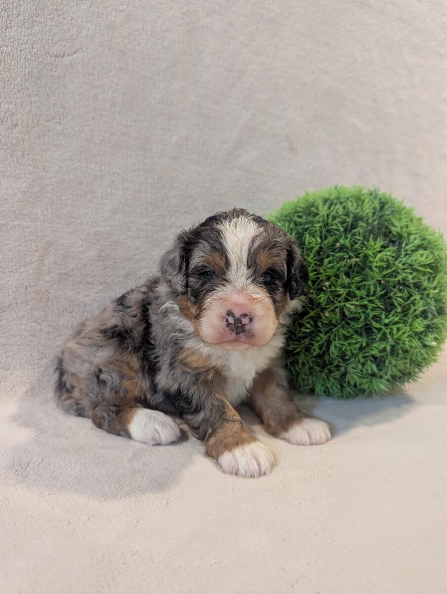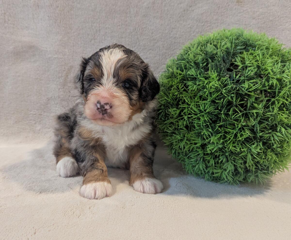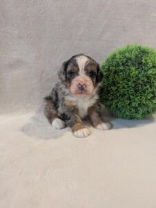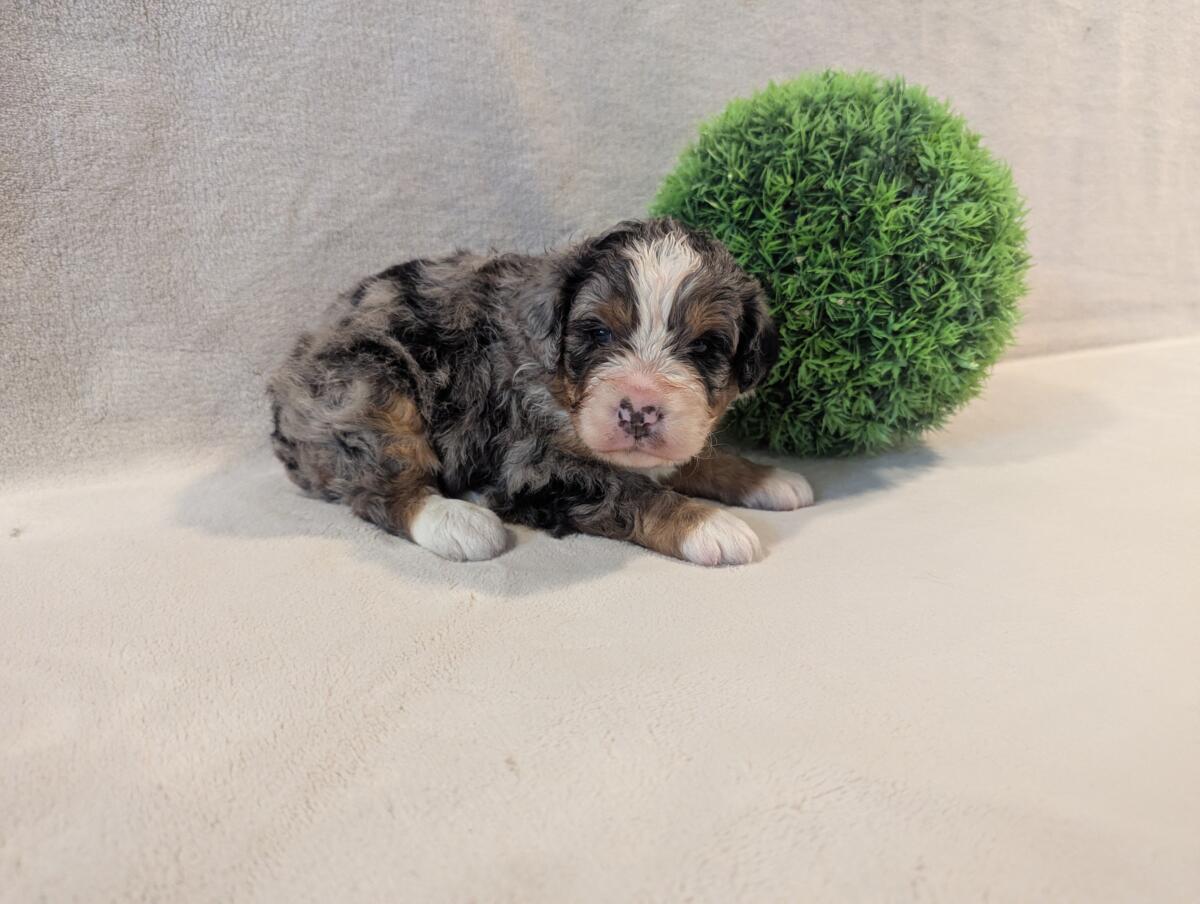 This beautiful Merle Bernedoodle is the perfect companion for snuggles, adventures, and everything in between. Her soft, wavy coat is hypoallergenic and mostly non-shedding, making her the perfect companion for families with allergies. She will come home current on all age-appropriate vaccinations and wormers. She will have had a visit with our vet to make sure she is healthy and ready to go to her new home. She will also come home with her own collar, leash, and chew toy. She will also have a personal blanket that smells like her mom to help with adjusting to her new home. She has been handled by people daily and has been exposed to many new experiences, sounds, and objects to help her to be more comfortable to her new home. She will have a AKC reunite microchip.